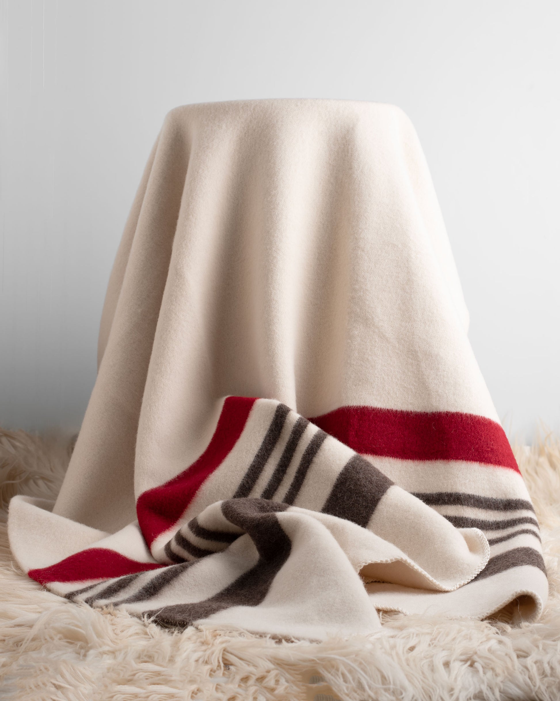 100% Wool Heavyweight Blanket - Natural White, Brown & Red Stripes
